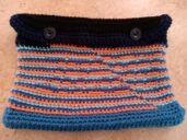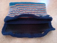 Mein Sohn sagte einmal, er bräuchte etwas für seinen Laptop, weil seine Laptoptasche etwas zu groß ist, damit er weniger wackelt. Also habe ich nochmal mit häkeln angefangen: größer, etwas bunt, mit Namen (etwas versteckt), verstärktem Boden sowie Rand und einen Deckel zum zuknöpfen.